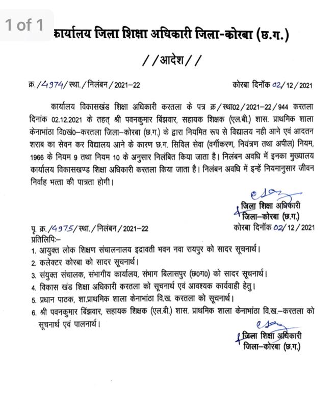 जिला शिक्षा अधिकारी जी.पी. भारद्वाज ने बताया कि विकासखण्ड शिक्षा अधिकारी करतला के द्वारा सहायक शिक्षक पवन कुमार के संबंध में सिविल सेवा आचरण के विपरित आचरण करने तथा शराब पीकर स्कूल आने की जानकारी दी गई थी। बी.ई.ओ. करतला के प्रतिवेदन पर संज्ञान लेते हुए स्कूल में अनुशासन हीनता और सेवा विपरित आचरण करने के कारण सहायक शिक्षक पवन कुमार को छत्तीसगढ़ सिविल सेवा नियम 1966 के नियम 09 तथा नियम 10 के अनुसार निलंबित किया गया है। उन्होंने बताया कि निलंबन अवधि में उनका मुख्यालय कार्यालय विकासखण्ड शिक्षा अधिकारी करतला किया गया है। निलंबन अवधि में उन्हें नियमानुसार जीवन निर्वाह भत्ता की पात्रता होगी।