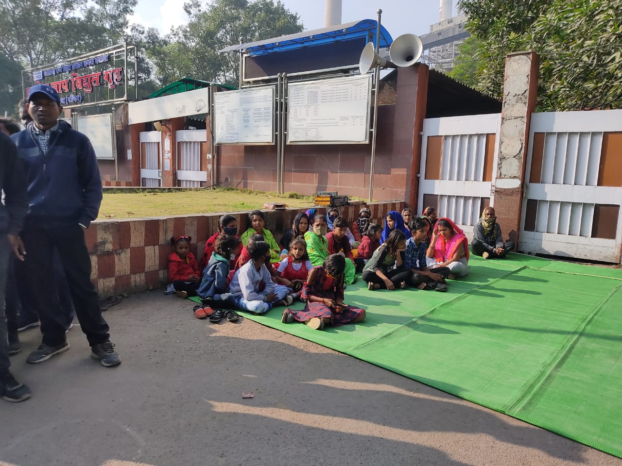 बीवी बच्चों के साथ संयंत्र के मुख्य द्वार पर ठेका श्रमिक दे रहे धरना