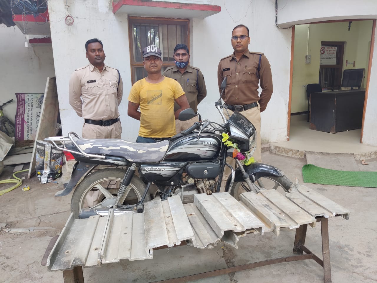 01. राम नरेश उर्फ राहुल टंडन पिता स्वर्गीय उत्तम दास टंडन उम्र 46 वर्ष साकिन पचरी पारा गणेश पंडाल के पास चौकी रामपुर थाना कोतवाली कोरबा होना बताया मोटरसाइकिल चालक से मोटरसाइकिल के पीछे रखे गए 2 बोरी में रखे एलमुनियम के बारे में पूछा गया तो उसने बताया कि 1 वर्ष पूर्व अपने कब्जे में रखे गए 8 नग एलमुनियम स्लैब 1 फीट चौड़ा 10 फीट लंबा वजन 60 किलो कीमती 7200 रुपए को बालको प्लांट के दीवार से अंदर घुसकर चोरी कर घर में रखा था जिसे दो सफेद बोरी में डालकर चोरी का माल बेचने के फिराक में टीपी नगर जा रहा था मोटरसाइकिल हीरो होंडा स्प्लेंडर सीजी 12 एजेड 3340 सहित जुमला 27,200 रुपए पाया गया। उक्त आरोपी के विरूद्ध धारा 41 (1-4) दप्रसँ/ 379 भादवि के तहत गिरफ्तार किया जाकर न्यायिक रिमाण्ड पर भेजा गया है।