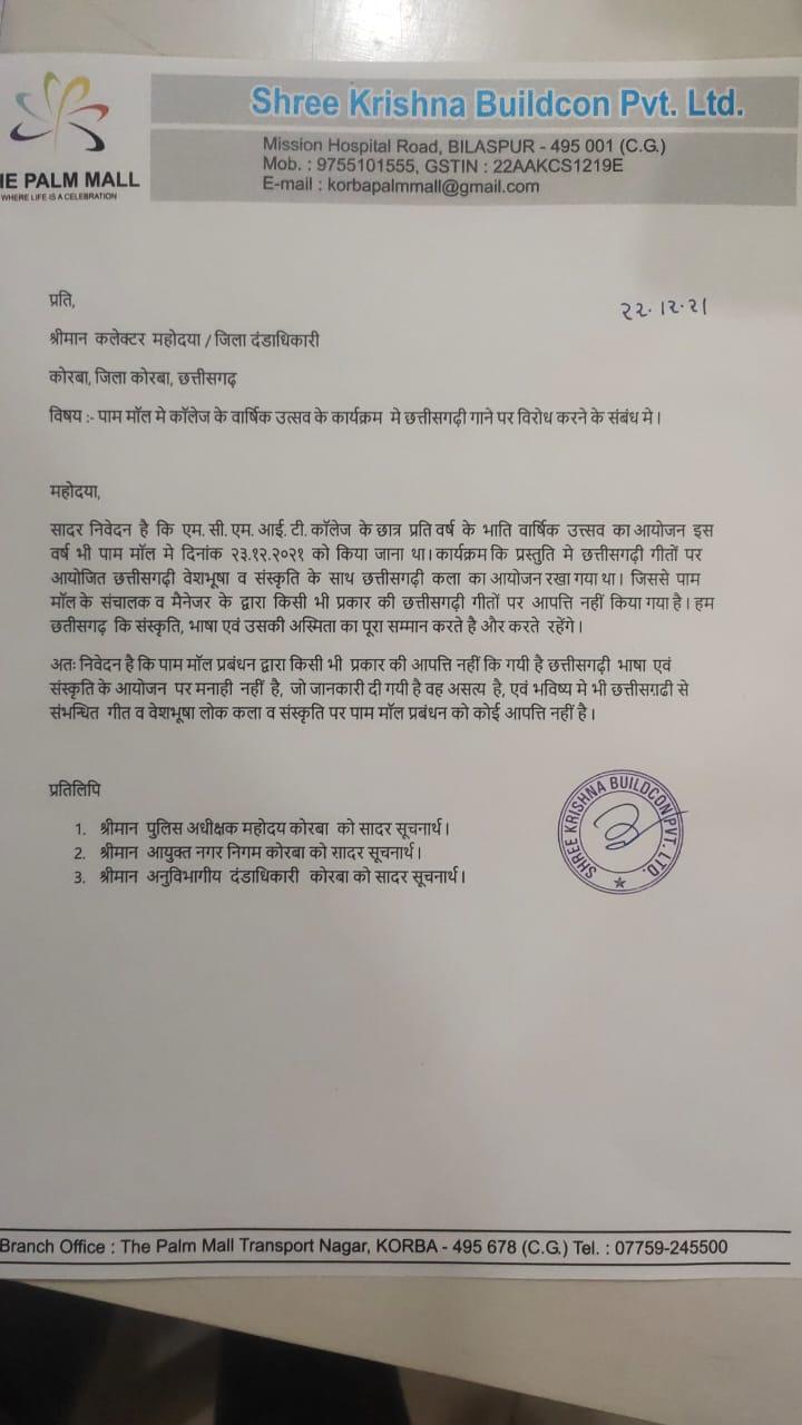 दरअसल कोरबा के एमसीएमआईटी कालेज के विद्यार्थियों ने एसडीएम को आवेदन प्रस्तुत कर सूचित किया था कि 23 दिसंबर पाम माल में वार्षिक उत्सव के दौरान छत्तीसगढ़ी वेशभूषा और संस्कृति तथा छत्तीसगढ़ी कला पर आधारित आयोजन पर माल के संचालक और मैनेजर ने आपत्ति कर कार्यक्रम को निषेध कर दिया है। इस पर संज्ञान लेते हुए कलेक्टर के निर्देश पर एसडीएम कोरबा ने माल संचालक को नोटिस जारी कर जानकारी माँगी थी। माल संचालक और प्रबंधन ने इस शिकायत को ग़लत बताते हुए स्पष्ट किया कि ऐसी कोई आपत्ति प्रबंधन ने नहीं की है और एमसीएमआईटी कालेज के आयोजन में छत्तीसगढ़ी भाषा, कला- संस्कृति और गीत आदि के आयोजन की मनाही नहीं है।