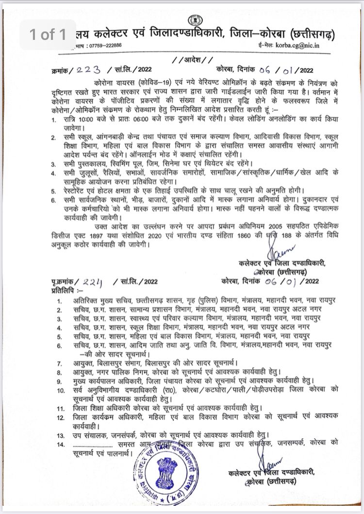 कोरबा(CGNEWS365.COM)/ 06 जनवरी 2022- कोरोना के बढ़ते संक्रमण को देखते हुए जिले में कोविड संक्रमण के रोकथाम के लिए दुकानों के खुलने और बंद होने की समय अवधि तय कर दी गई है। कलेक्टर रानू साहू ने इस संबंध में जरूरी आदेश जारी कर दिए हैं। जिले के सभी दुकाने रात्रि 10 बजे से सुबह 6 बजे तक बंद रहेंगे। इस अवधि में केवल लोडिंग अनलोडिंग का काम किया जाएगा। सभी स्कूल, आंगनबाड़ी केंद्र, पंचायत एवं समाज कल्याण विभाग, आदिवासी विकास विभाग, स्कूल शिक्षा विभाग एवं महिला बाल विकास विभाग द्वारा संचालित आवासीय संस्थाएं आगामी आदेश तक बंद रहेंगे। ऑनलाइन मोड में कक्षाएं संचालित होंगी।