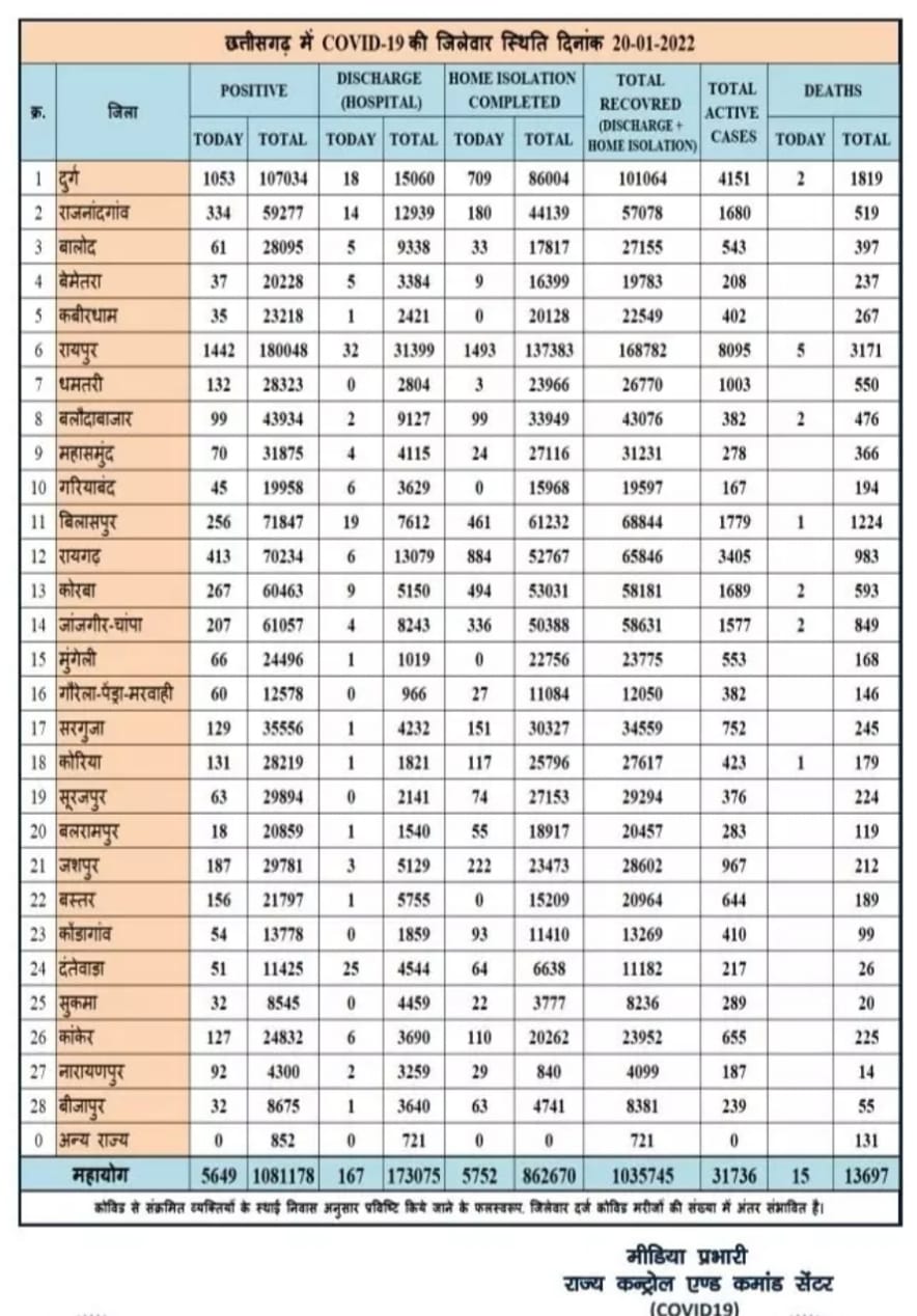 इसी प्रकार सम्पूर्ण छत्तीसगढ़ में 5649 नए कोविड संक्रमितो की पहचान हुई है।