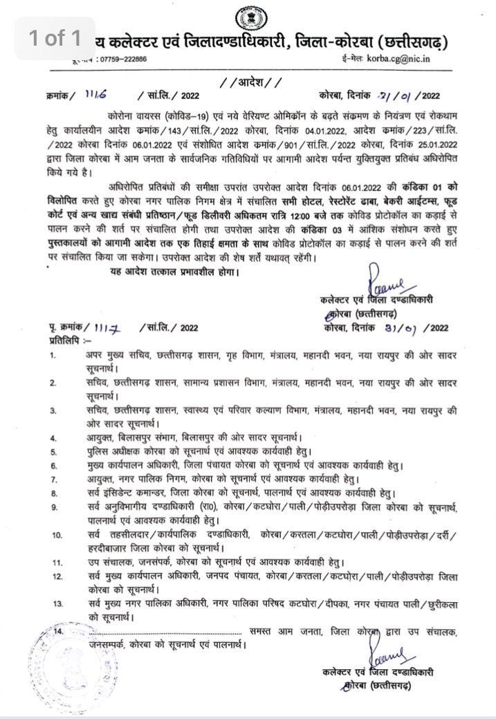 होटल-रेस्टोरेंट रात 12 बजे तक खुल सकेंगे, लायब्रेरी भी एक तिहाई क्षमता के साथ खुलेंगी, कलेक्टर ने जारी किया संशोधित आदेश