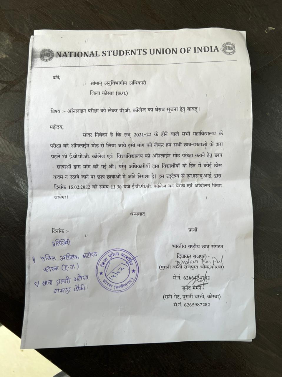 कोरबा(CGNEWS365.COM)/ 15 फरवरी 2022- छात्र – छात्राओं द्वारा कॉलेज एवं विश्वविद्यालयों में ऑनलाईन मोड परीक्षा कराए जाने मांग की जाा रही है, उक्त मांग पूर्व में भी सभी छात्र-छात्राओं के द्वारा की गई थी इसके बाद भी अधिकारीयों द्वारा विद्यार्थियों के हित में कोई उचित कदम नही उठाये जाने से छात्र निराश हैं। ऑनलाइन एग्जाम कराने की मांग को लेकर एनएसयूआई द्वारा आज 11:30 बजे ई.वी.पी.जी. कॉलेज का घेराव एवं आंदोलन किया जाएगा