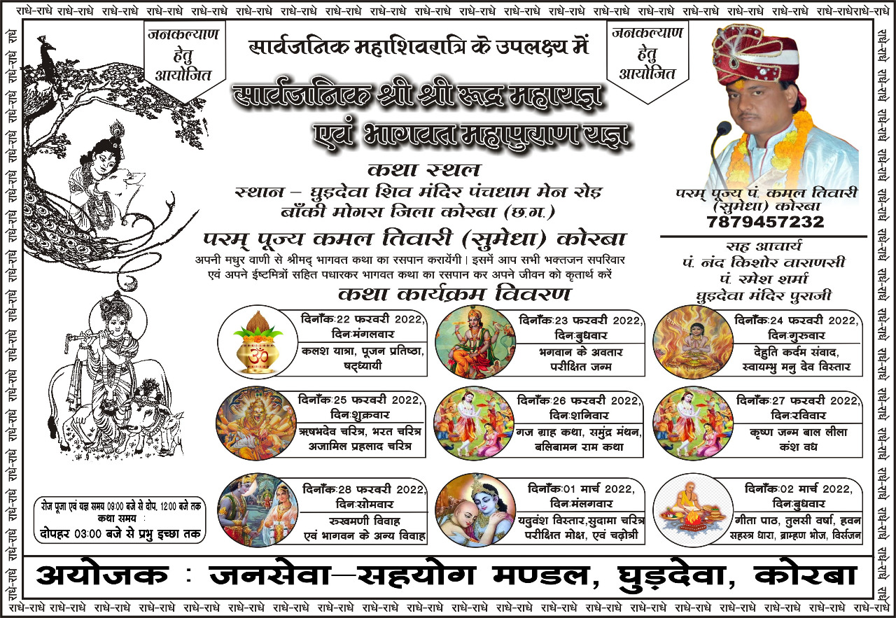 कोरबा(CGNEWS365.COM)/ 21 फरवरी 2022-घुड़देवा शिव मंदिर पंचधाम में 22 फरवरी से 2 मार्च तक रुद्र महायज्ञ एवं भागवत महापुराण यज्ञ का शुभारंभ किया जा रहा है इस धार्मिक आयोजन में पं. श्री कमल तिवारी (सुमेधा वाले) अपनी मधुर वाणी से श्रीमद भागवत कथा का रसपान कराएंगे। आयोजन में सभी भक्तों व परिजनों, अपने इष्टमित्रों सहित पधारकर कथा का रसपान कर अपने जीवन को कृतार्थ करें।