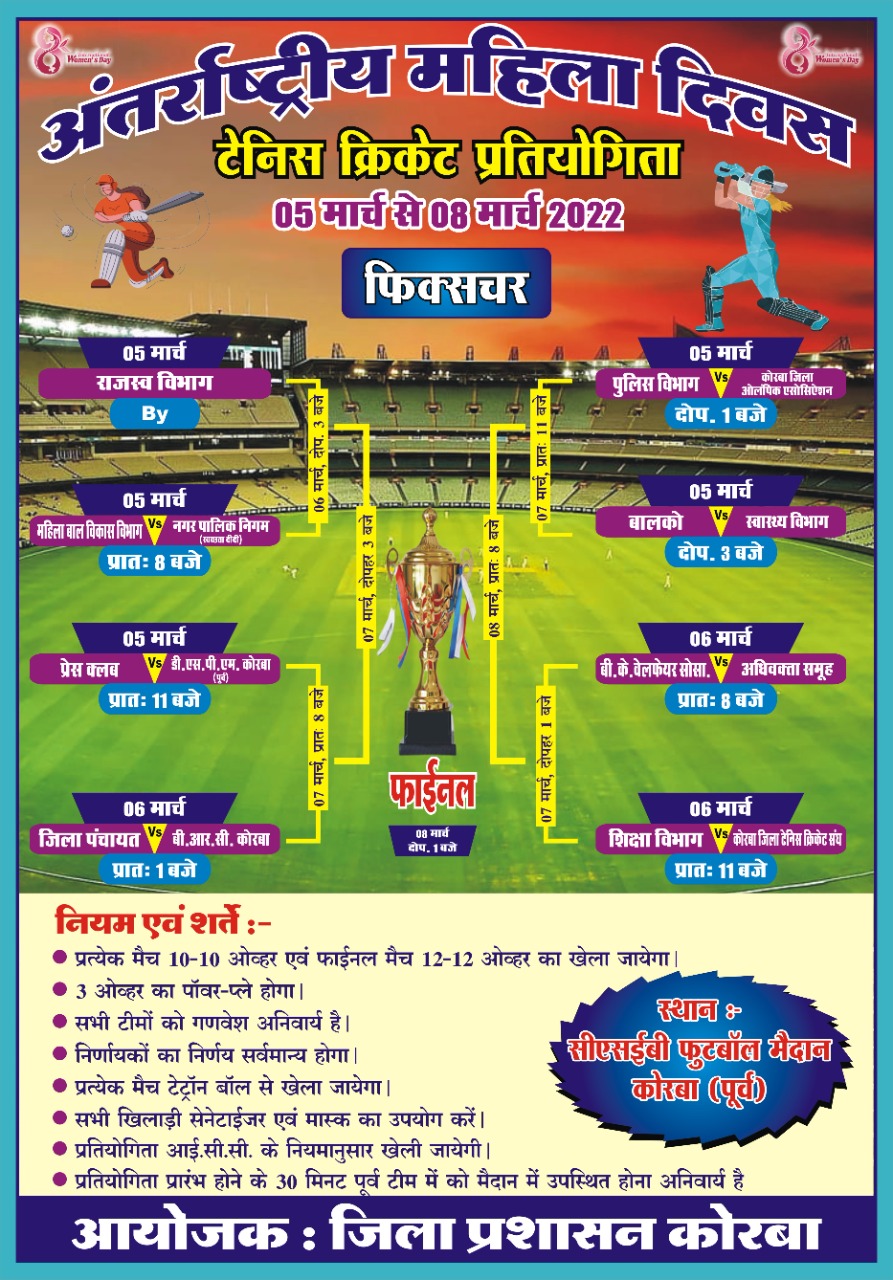 कोरबा(CGNEWS365.COM)/ 22 फरवरी 2022- अंतर्राष्ट्रीय महिला दिवस के अवसर पर जिला प्रशासन द्वारा महिला क्रिकेट प्रतियोगिता का आयोजन किया जा रहा हैं। यह प्रतियोगिता 05 मार्च 2022 से 08 मार्च 2022 तक कोरबा शहर स्थित सीएसईबी फुटबॉल ग्राउंड पूर्व में आयोजित होगी। महिला क्रिकेट प्रतियोगिता में कुल 15 टीमें हिस्सा लेगी। प्रतियोगिता पूर्णतः निःशुल्क होगी। प्रतियोगिता मेें विजेता, उपविजेता एवं प्रतियोगिता में उत्कृष्ट प्रदर्शन करने वाले प्रतिभागियों को विशेष पुरस्कार भी प्रदान किया जाएगा। प्रतियोगिता में राजस्व विभाग, पुलिस विभाग, महिला एवं बाल विकास विभाग, शिक्षा विभाग, नगर पालिक निगम, बालको , प्रेस क्लब , बी.के. वेलफेयर सोसाइटी, डीएसपीएम कोरबा ईस्ट, स्वास्थ्य विभाग, जिला पंचायत, अधिवक्ता समूह, कोरबा जिला ओलंपिक एसोसिएशन, कोरबा जिला टेनिस क्रिकेट संघ एवं बीआरसी कोरबा की महिला टीमें हिस्सा लेंगी। क्रिकेट प्रतियोगिता 10-10 ओवर का होगा। प्रतियोगिता में क्रिकेट टेट्रान बॉल से खेला जाएगा। प्रतियोगिता में विशेष पुरस्कार से सम्मानित किया जाएगा।