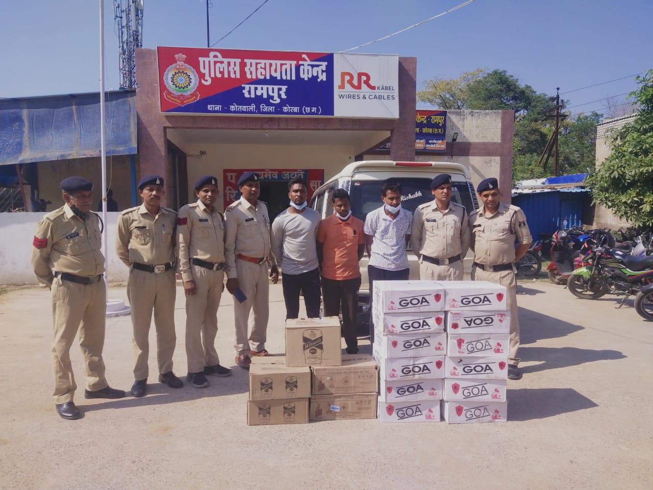 पुलिस अधीक्षक भोजराम पटेल, अतिरिक्त पुलिस अधीक्षक कोरबा अभिषेक वर्मा, नगर पुलिस अधीक्षक योगेश साहू, थाना प्रभारी कोतवाली निरीक्षक रामेन्द्र सिंह के मार्गदर्शन पर लगातार जुआ, सट्टा, अवैध शराब एवं नारकोटिक्स एक्ट पर कार्यवाही हेतु निर्देशित किया गया है जिसके परिपालन में मंगलवार की अलसुबह पुलिस को मुखबिर द्वारा सूचना मिली कि एक स्कार्पियो वाहन सीजी 13 ए एफ 5122 में अवैध रूप से मध्यप्रदेश की शराब रिश्दी चौक से करतला की तरफ जाएंगे, सूचना मिलने पर वरिष्ठ अधिकारियों को अवगत कराया गया। वरिष्ठ अधिकारियों द्वारा तत्काल घेराबंदी हेतू आदेशित करने पर पर चौकी प्रभारी रामपुर राजीव श्रीवास्ताव हमराह स्टाफ एवं गवाहों के साथ रिश्दी चौक में सघन नाकेबंदी कर आने जाने वाले वाहनो को चैकिंग प्रारंभ किये, चैकिंग के दौरान रात्रि करीब 3:10 बजे बालकों की तरफ से एक सफेद रंग का स्कार्पियो वाहन कमांक सीजी 13 ए एफ 5122 आया जिसे रोकने पर वाहन में सवार व्यक्तियों द्वारा अपना नाम क्रमशः प्रदीप कुमार अग्रवाल पिता मोहन लाल अग्रवाल उम्र 36 वर्ष सा. बेहरचुंवा थाना करतला, अभिषेक यादव पिता बोधनलाल यादव उम्र 22 वर्ष सा. परसापाली थाना बाराद्वार तथा मुकेश कुमार राठिया पिता रामायण सिंह राठिया उम्र 24 वर्ष सा० बेहरचुंवा थाना करतला बताये जिन्हें मुखबीर सूचना से अवगत कराकर उनके समक्ष स्कार्पियो वाहन क्रमांक सीजी 13 ए एफ 5122 की तलाशी लेने पर 12 पेटी गोवा मदिरा प्रत्येक 180 एम. एल. वाली 600 सीलबंद शीशी में भरी अंग्रेजी मदिरा कीमती 63,000/- रुपये, 02 पेटी मैकडावल नं.1 मंदिरा प्रत्येक 180 एम. एल. वाली 96 सीलबंद शीशी में भरी अंग्रेजी मदिरा कीमती 22,560/ रुपये, 02 पेटी रॉयल स्टेग मदिरा प्रत्येक 180 एम.एल. वाली 96 सीलबंद शीशी में भरी अंग्रेजी मदिरा कीमती 24,960/- रुपये, 01 पेटी मैकडावल नं.1 मदिरा प्रत्येक 750 एम. एल. वाली 12 सीलबंद शीशी में भरी अंग्रेजी मदिरा कीमती 11.520/- रुपये जुमला मात्रा 26976 एम. एल. जुमला कीमती 122040/- रुपये व घटना में प्रयुक्त स्कार्पियो वाहन क्रमांक सीजी 13 ए एफ 5122 कीमती 9,00,000/- रुपये को गवाहों के समक्ष आरोपियों के कब्जे से जप्त किया गया।आरोपियों पर धारा 34 (2), 59 (क) आबकारी अधिनियम का घटित करना पाये जाने से विधिवत् गिरफ्तार कर माननीय न्यायालय के समक्ष प्रस्तुत किया गया है।
