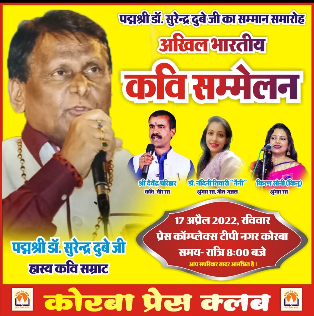 सीजी न्यूज़ 365.com प्रेस काम्पलेक्स टीपी नगर परिसर में 17 अप्रैल रविवार को सम्मान समारोह एवं अखिल भारतीय कवि सम्मेलन का आयोजन होने जा रहा है। छत्तीसगढ़ के सुप्रसिद्ध हास्य कवि पद्मश्री डॉ. सुरेंद्र दुबे की विशेष उपस्थिति में यह सम्मान समारोह एवंं कवि सम्मेलन होगा। इस अवसर पर वीर रस के कवि देवेन्द्र परिहार, श्रृंगार रस की कवयित्री डॉ. नंदिनी तिवारी नैनी,किरण सोनी गीत-गजलों की प्रस्तुति देंगे। 17 अप्रैल को रात्रि 8 बजे से होने वाले इस आयोजन में प्रेस क्लब के पदाधिकारियों व सदस्यों ने सहपरिवार उपस्थित होने का आग्रह किया है।